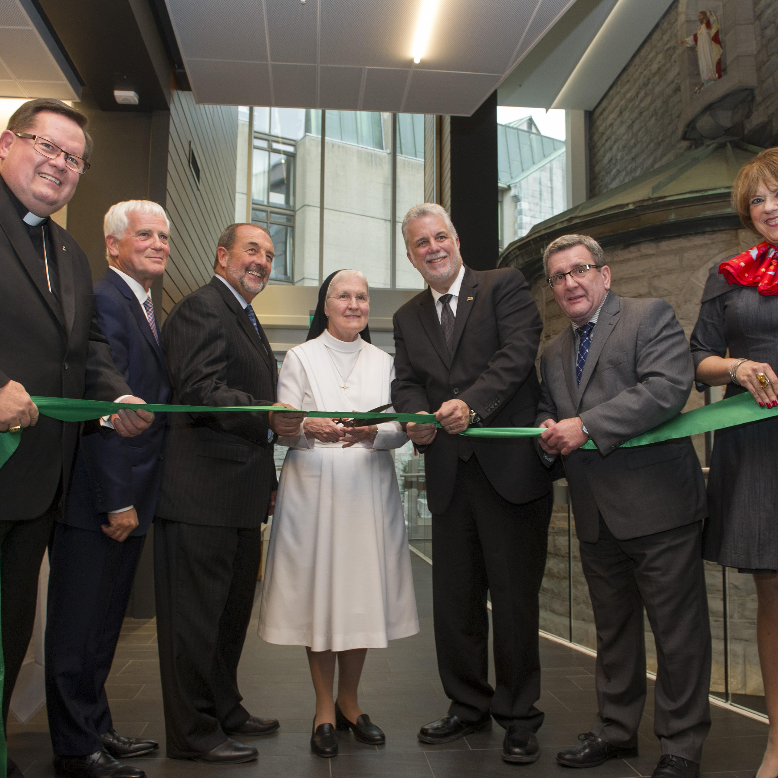 The afternoon of September 30th solemnly underscored the end of the ambitious restoration of the Monastère des Augustines. For this official inauguration, the Fiducie held a ceremony under the honorary presidency of Quebec Premier, Philippe Couillard; the Minister of the Canada Economic Development for Quebec Regions, Denis Lebel; the Cardinal of Québec, Gérald Cyprien Lacroix; the Mayor of Québec, Régis Labeaume; the Minister of Culture and Communications, Hélène David; the Superior General of the Fédération des monastères des Augustines, Sister Lise Tanguay; and, the president of the Fiducie, Marcel Barthe. These dignitaries cut the ribbon, symbolically marking this heritage building’s new vocation.