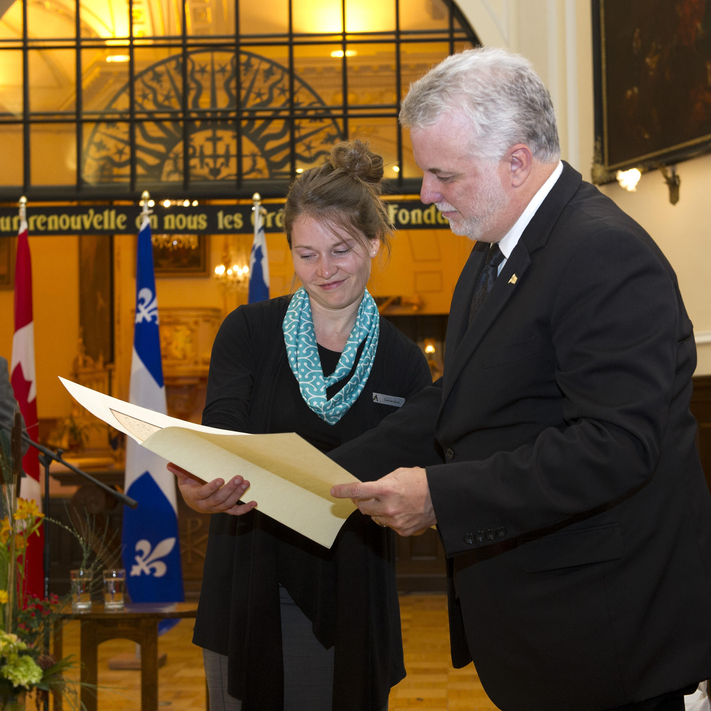 The master of ceremonies, Denis Robitaille, centred his speech on history, drawing inspiration from many texts found in the archives of the Monastère des Augustines. Among these brief forays into history, the audience learned that Guillaume Couillard, one of the Quebec Premier’s ancestors, was present in the L’Hôtel-Dieu de Québec monastery when, on October 15, 1654, the first stone was placed and blessed for the chapel and sick ward. A reproduction of this historical text was presented to Philippe Couillard at the end of the speech.