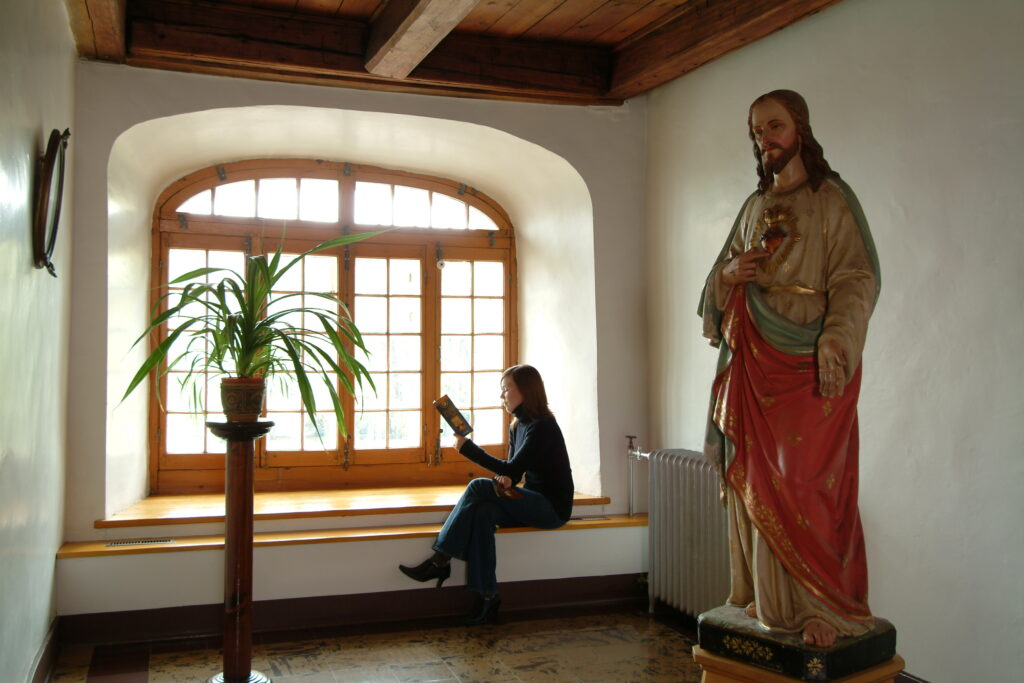 À l’origine, les fenêtres étaient plus grandes et rappelaient les dimensions des arches d’un déambulatoire monastique. En 1876, pour des raisons d’efficacité énergétique, les Augustines ont décidé de réduire leur dimension, sacrifiant ainsi un élément fort de leur monastère : la luminosité inspirante qui accompagnait leurs déplacements en procession et leurs temps de prière personnelle.