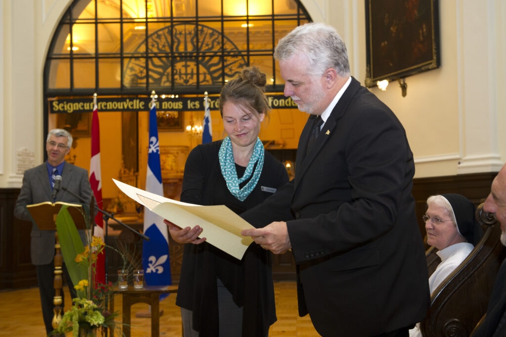 Le maître de cérémonie, Denis Robitaille, a placé l’histoire au cœur de ses interventions en s’inspirant de divers textes provenant des archives du Monastère des Augustines. Parmi ces brefs retours dans le passé, l’assistance a appris que Guillaume Couillard, l’un des ancêtres du premier ministre du Québec, était présent au monastère de L’Hôtel-Dieu de Québec lors de la cérémonie de la pose et de la bénédiction de la première pierre de la chapelle et de la salle des malades le 15 octobre 1654. Une reproduction de ce texte d’archive a d’ailleurs été remise à Philippe Couillard dès la fin de son allocution.