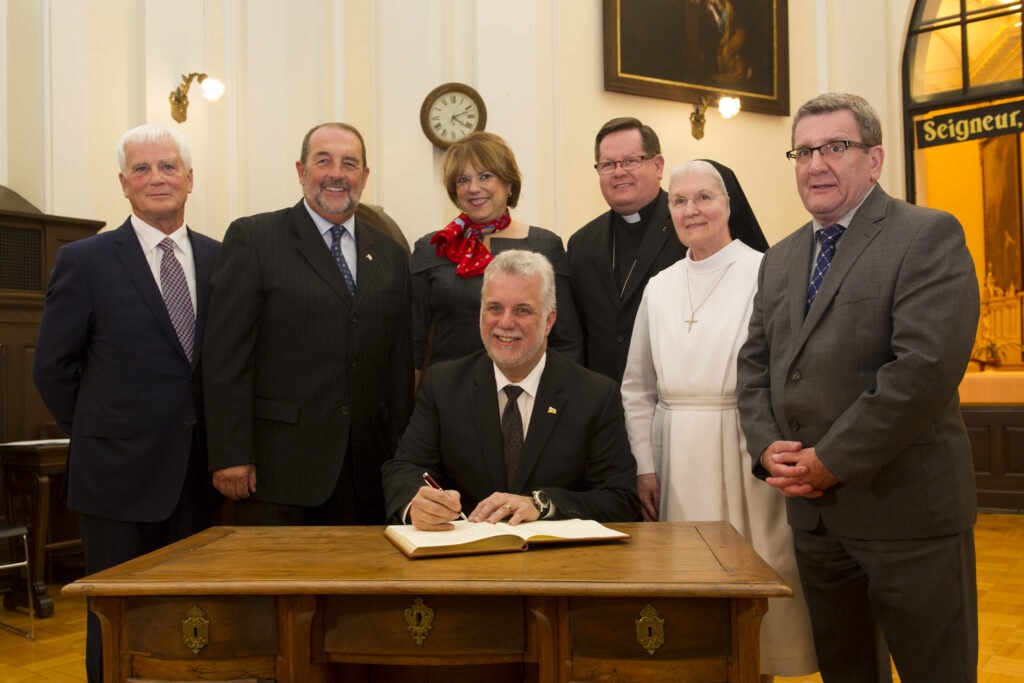 L’après-midi du 30 septembre dernier a marqué solennellement l’accomplissement du grand projet de restauration et de remise à niveau du Monastère des Augustines. La Fiducie a tenu une cérémonie d’ouverture officielle sous la présidence d’honneur du premier ministre du Québec, Philippe Couillard, du ministre de l’Agence de développement économique du Canada pour les régions du Québec, Denis Lebel, du cardinal de Québec, Gérald-Cyprien Lacroix, du maire de Québec, Régis Labeaume, de la ministre de la Culture et des Communications, Hélène David, de la supérieure générale de la Fédération des monastères des Augustines, sœur Lise Tanguay et du président de la Fiducie, Marcel Barthe.